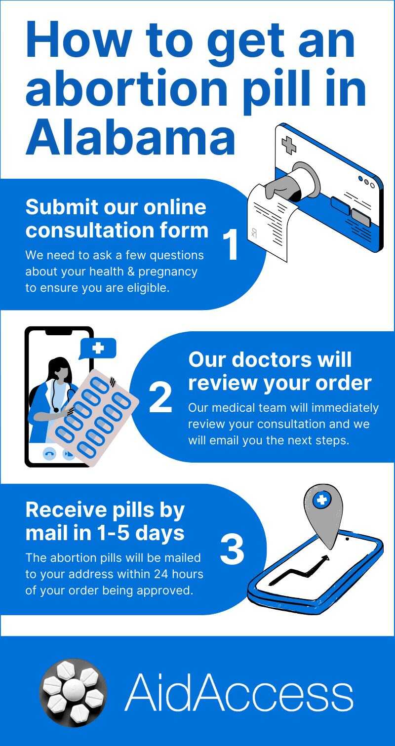 Infographic explaining how to get an abortion pill in Alabama from Aid Access.