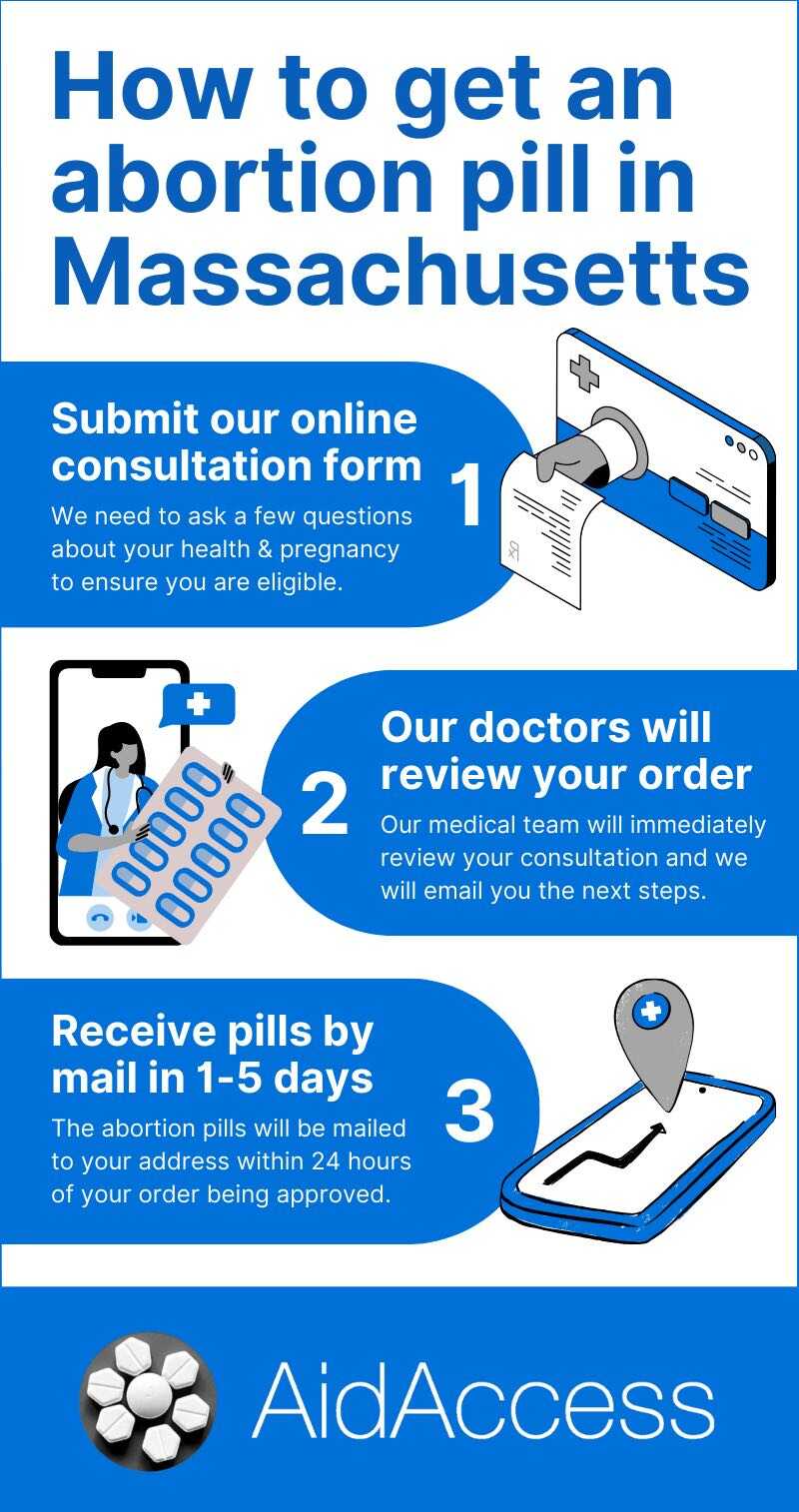 Infographic explaining how to get an abortion pill in Massachusetts from Aid Access.