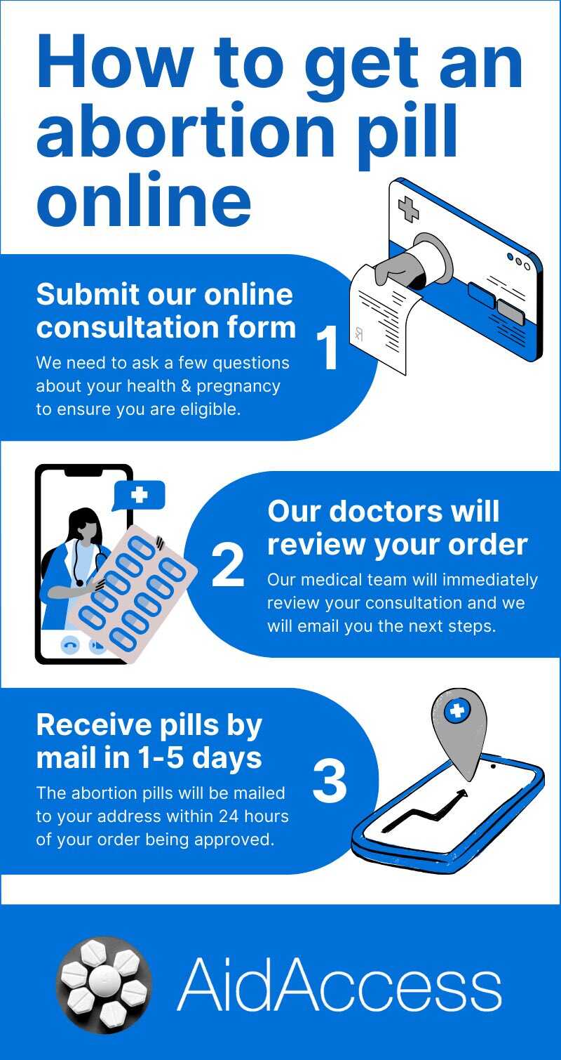 Infographic: How to get the abortion pill online in the U.S. from Aid Access. We can help you get the abortion pill online regardless of where you live. Abortion pills are now accessible by mail to everyone in the United States.