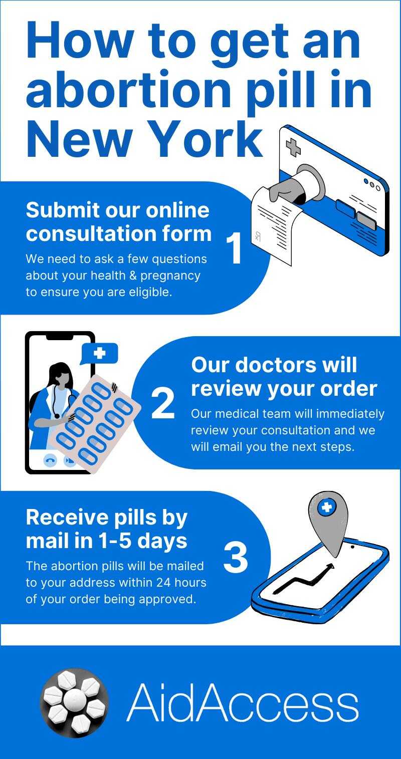 Infographic explaining how to get an abortion pill in New York from Aid Access.